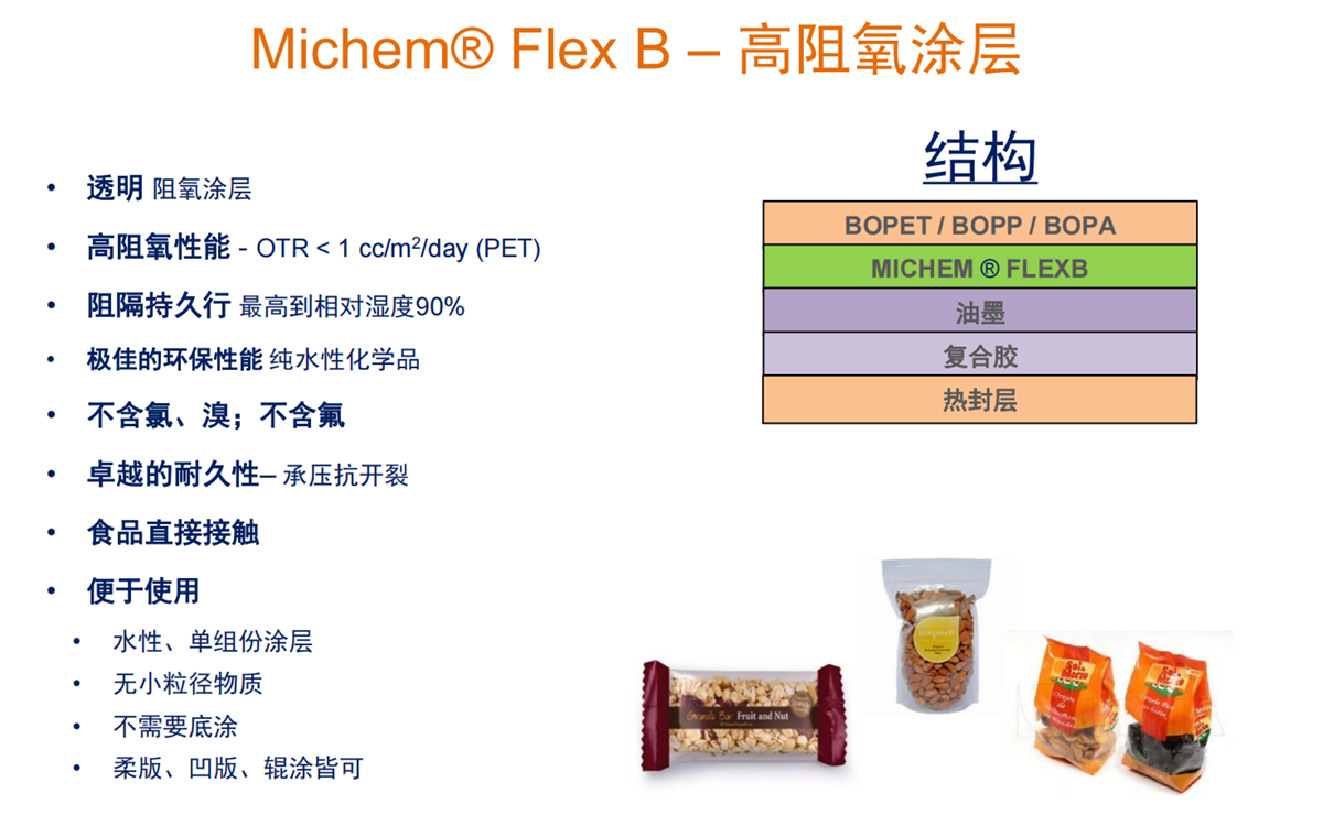軟包裝的解決方案:阻氧涂層-在聚烯烴基材上具有較好的耐久性,阻氧效果可達(dá)到1cc/m2/day。熱封涂層-低熱起封溫度且具有優(yōu)異的熱封強(qiáng)度,擠出復(fù)合底涂-可加強(qiáng)薄膜、鋁箔以及紙張等基材與擠出樹(shù)脂(例如聚乙烯和特種聚合物)之間的粘連強(qiáng)度,上光油-提高表面的光澤度和防水。